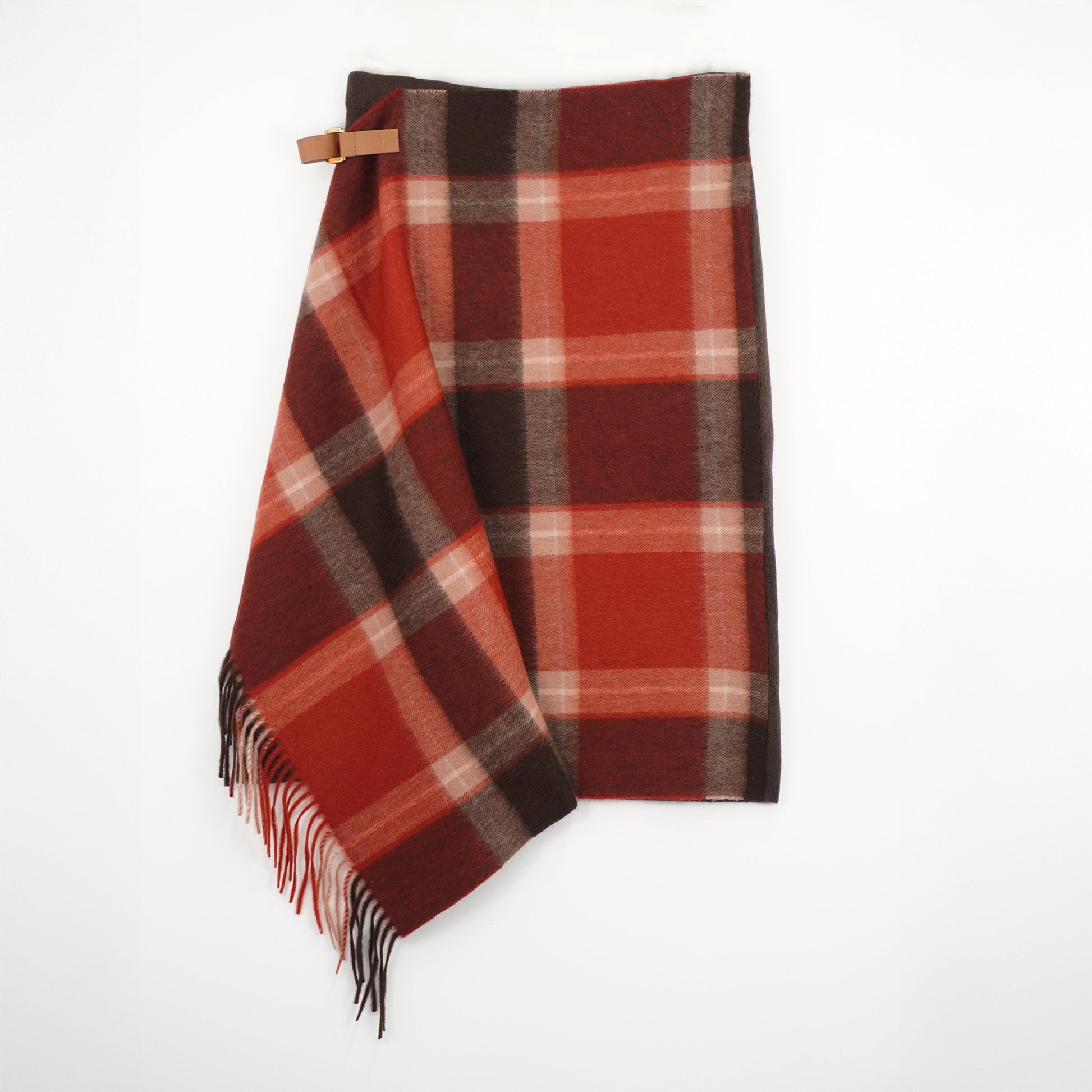 カシミヤマフラーとカシミヤニット編み地のハイブリッド巻きスカート。流れるようなドレープとひらめくフリンジが、動くたびに表情を変えます。軽やかな素材感が心地よく、膝丈だからロングブーツとの相性も抜群。上質なカシミヤの優しさに包まれながら、大人っぽくも遊び心のあるスタイルが完成します。