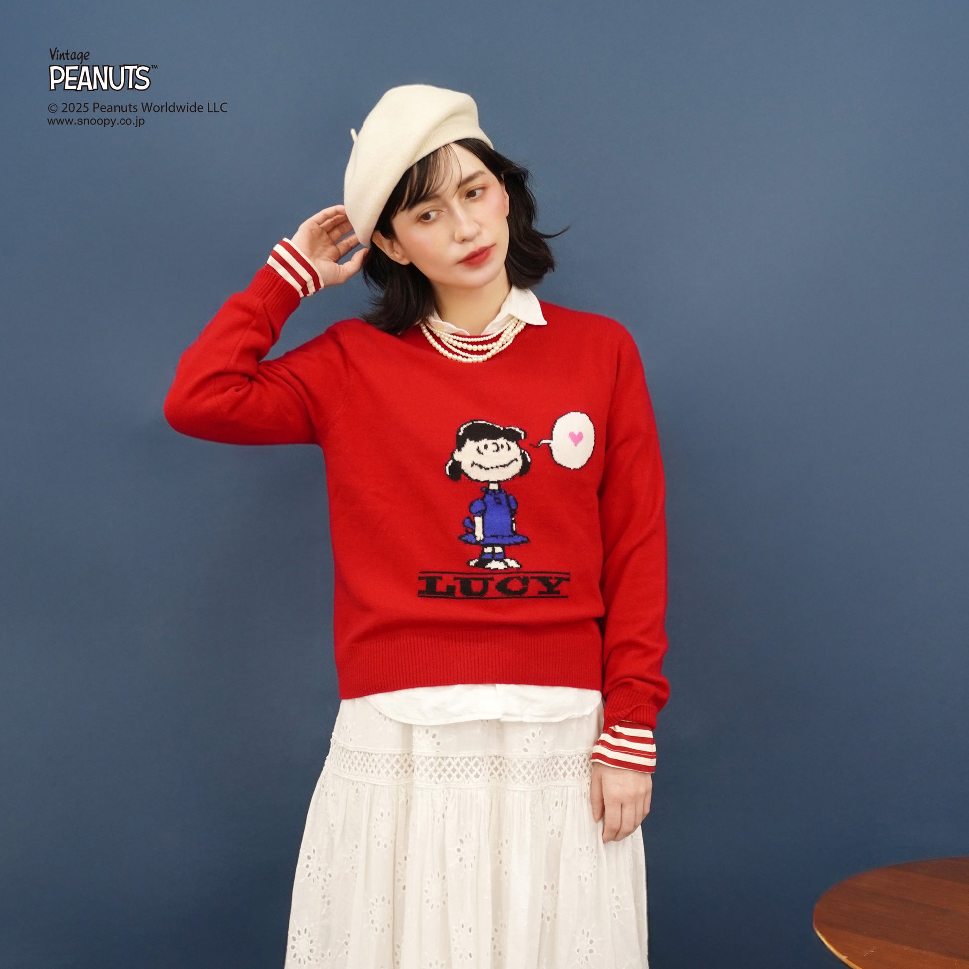 スヌーピーの相棒ルーシーをモチーフにした、遊び心満載のコラボセーター。短めの丈感で今っぽいシルエットを実現し、赤とブルーの鮮やかなカラーリングが一枚で存在感抜群。トレンドを意識したサイズ感だから、レイヤードスタイルやハイウエストボトムスとの相性も◎。キャラクターの魅力を引き出しながら、毎日のコーディネートに遊び心をプラスできる一枚です。